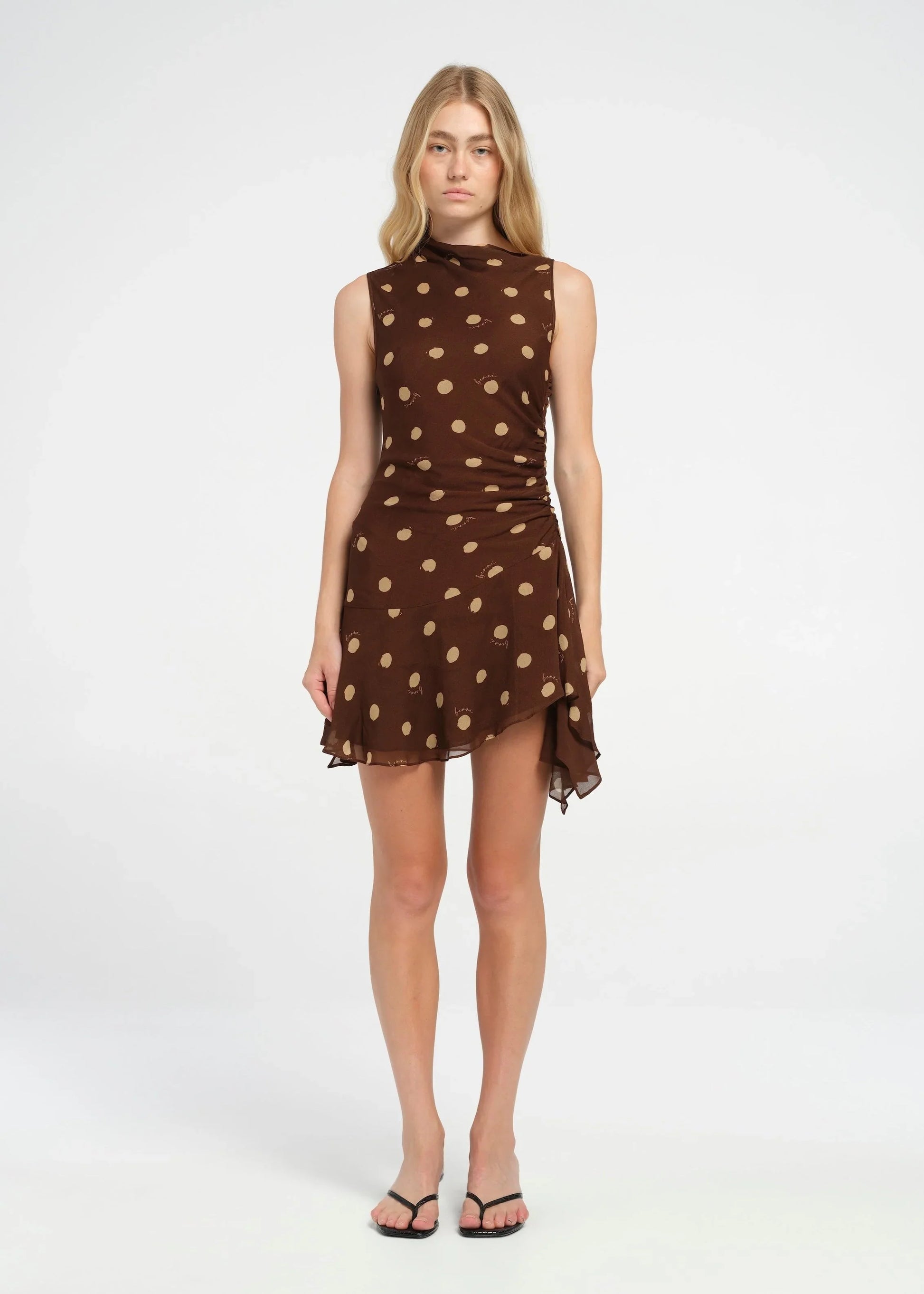 Chic, flirty, and irresistibly modern. The Bella Dress brings together a high neckline and asymmetrical hem in a breezy chocolate chiffon scattered with playful polka dots. The subtle ruching at the waist highlights your shape without effort, making it the ideal dress for warm afternoons, brunches, or city strolls with attitude.