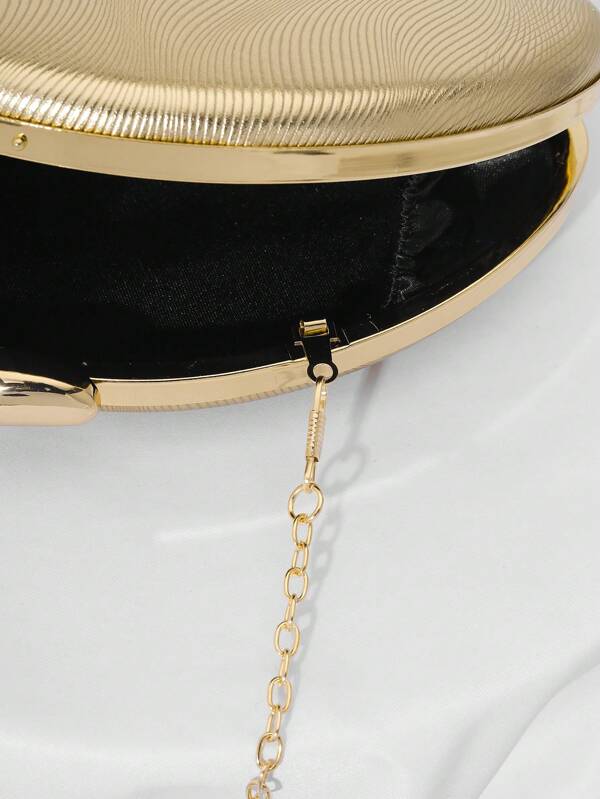A bold celebration of modern luxury, the Golden Eclipse Clutch draws the eye with its sculptural round silhouette and wave-textured metallic finish. Minimal yet striking, it is a radiant companion for soirées, designed to frame your presence with golden light.