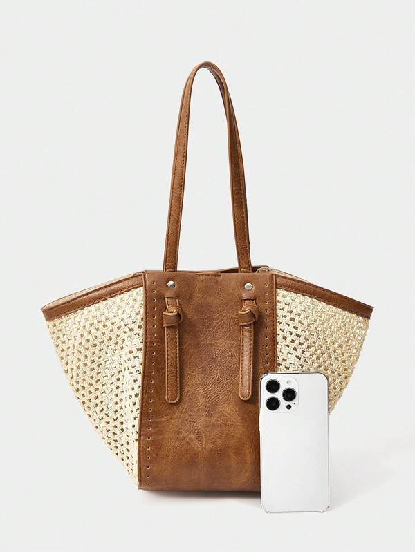 This tote blends tradition and modernity with handwoven raffia panels framed by smooth faux leather. The structured shape and earthy tones create a versatile piece that carries the essence of craftsmanship and timeless style.