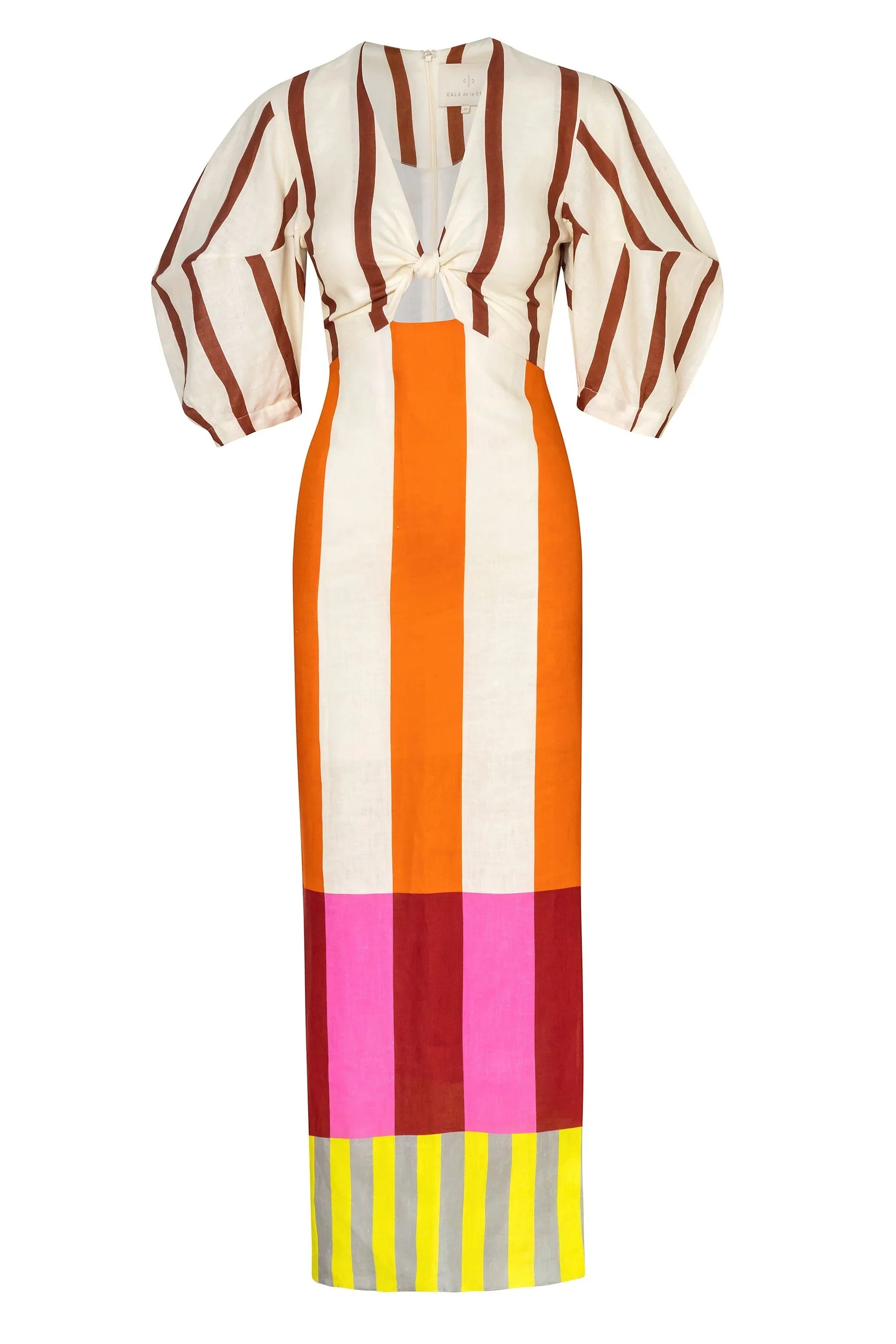 Blending sophisticated stripes with vibrant blocks of color — citrus orange, radiant pink, and touches of lime green — this dress celebrates the joy of living in motion. With its sculptural puff sleeves and knotted front detail, it creates a silhouette that is both relaxed and refined.