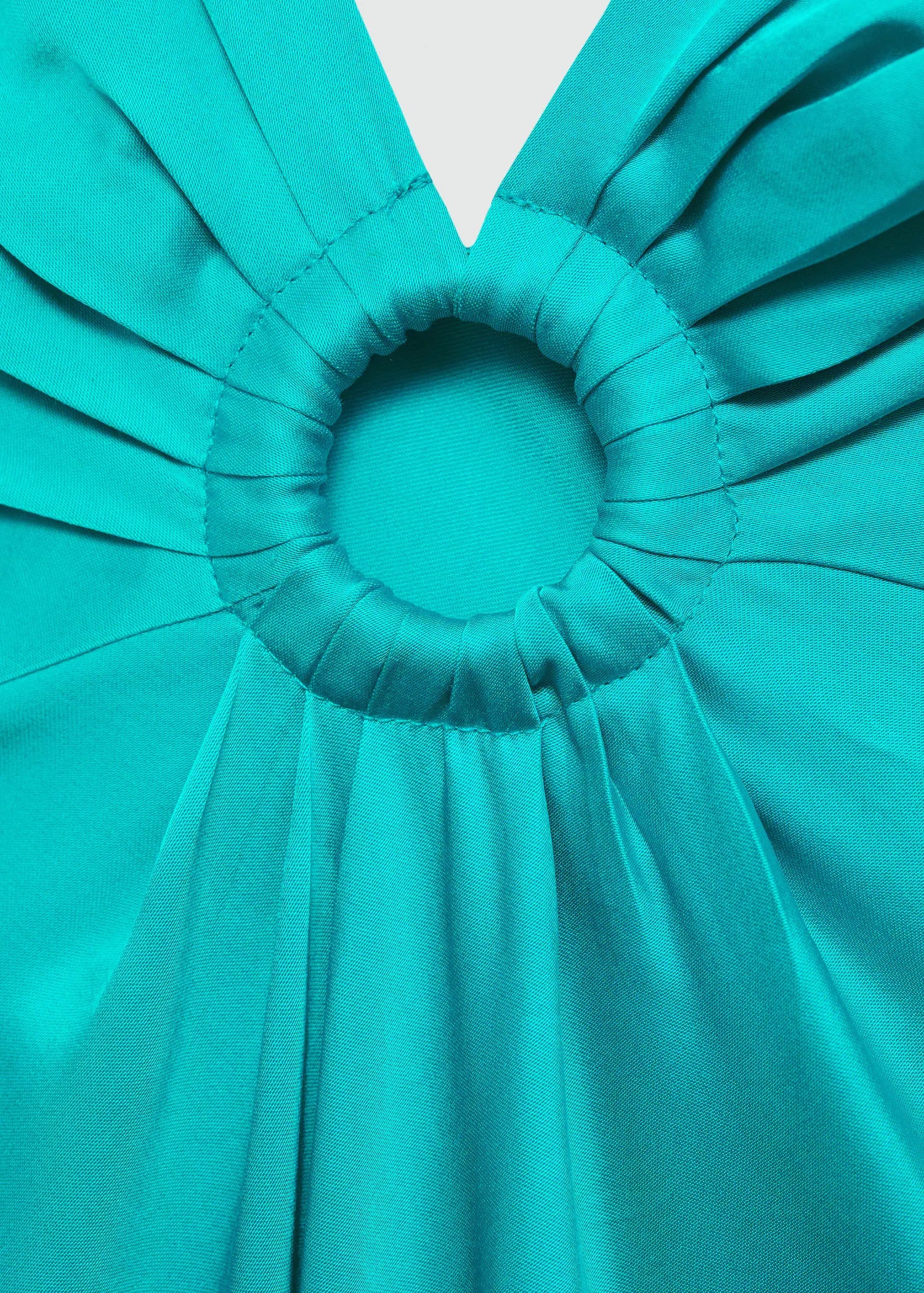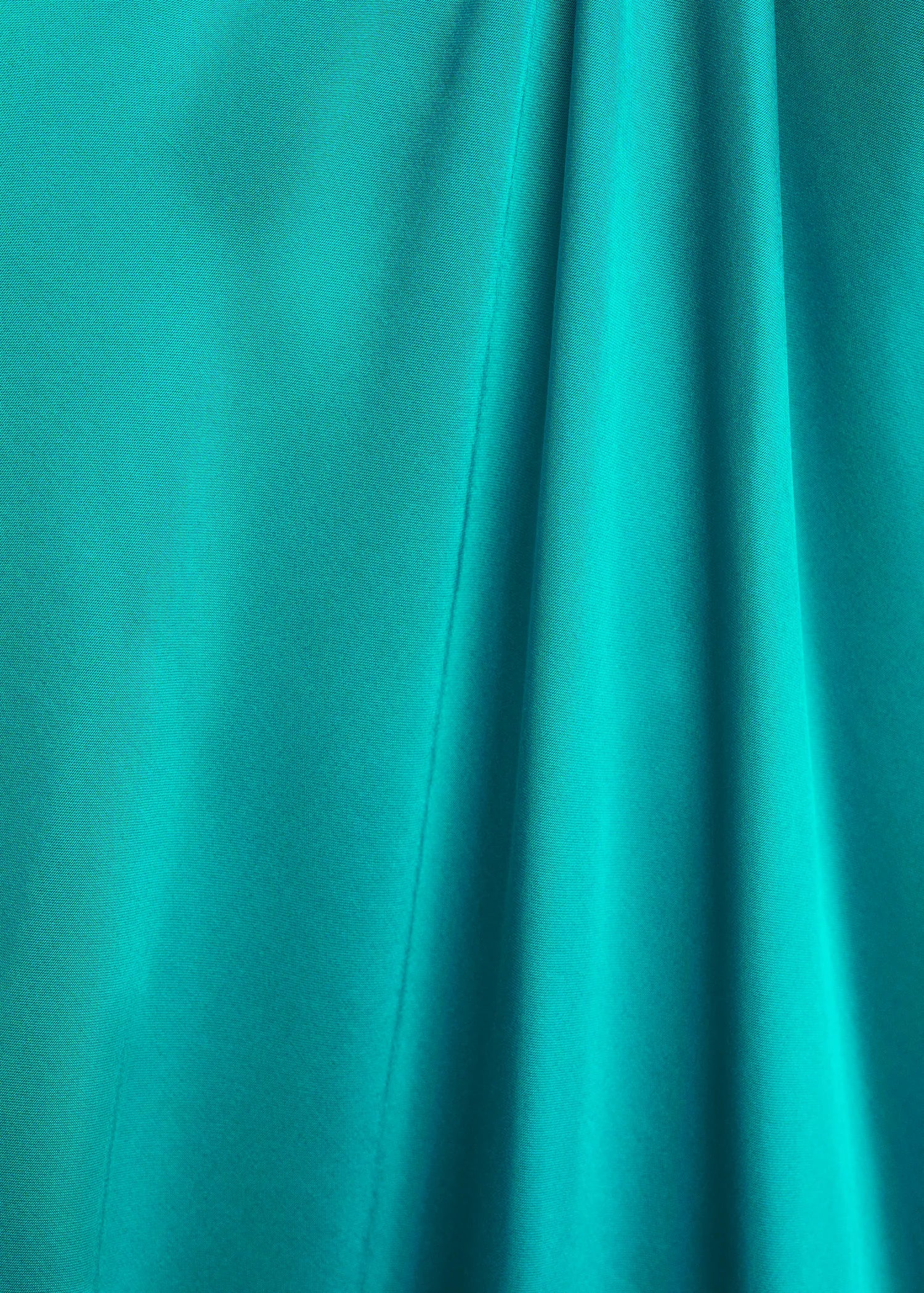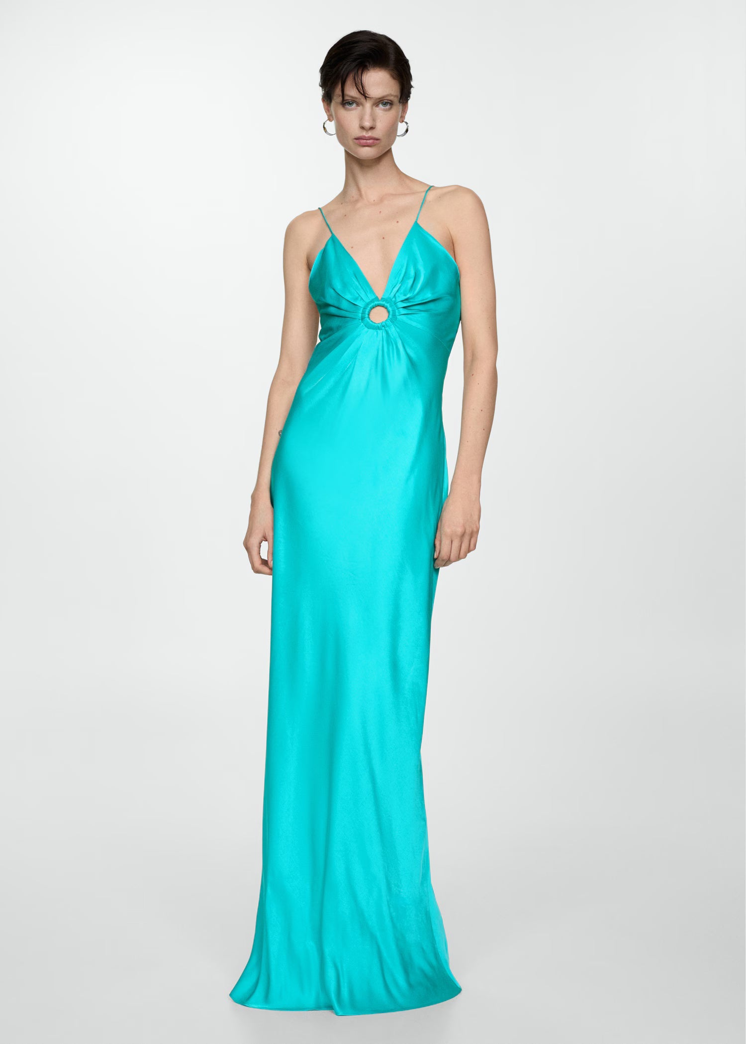 An iconic statement piece designed to capture every gaze. The Turquoise Horizon Dress features a luminous satin finish in a striking turquoise shade, evoking summer nights and coastal elegance. The plunging neckline with a gathered ring detail sculpts the bust with sophistication, while the fluid silhouette drapes effortlessly along the body, elongating the figure with timeless allure. An ode to effortless glamour, this dress is perfect for soirées, seaside dinners, or a modern goddess moment under the stars.
